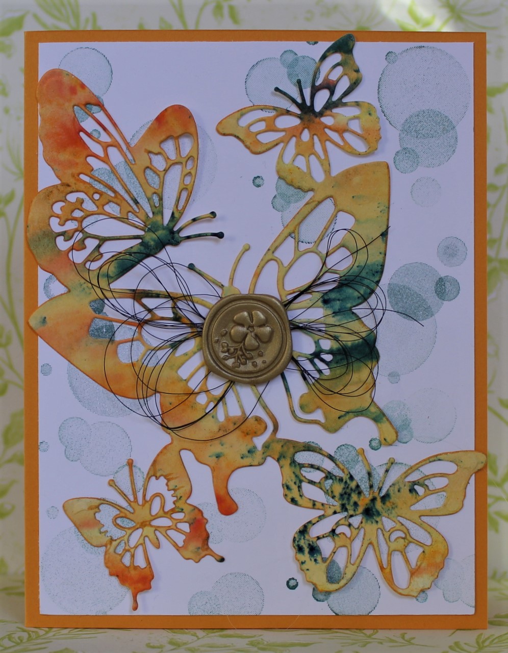 I used Brushos on Shimmery White cardstock to colour the paper for the butterflies. On the Whisper White layer, I stamped the bubbles from Beauty Abounds using Tranquil Tide ink. The card base is Mango Melody, which matches really well with the Yellow and Gamboge Brushos.
