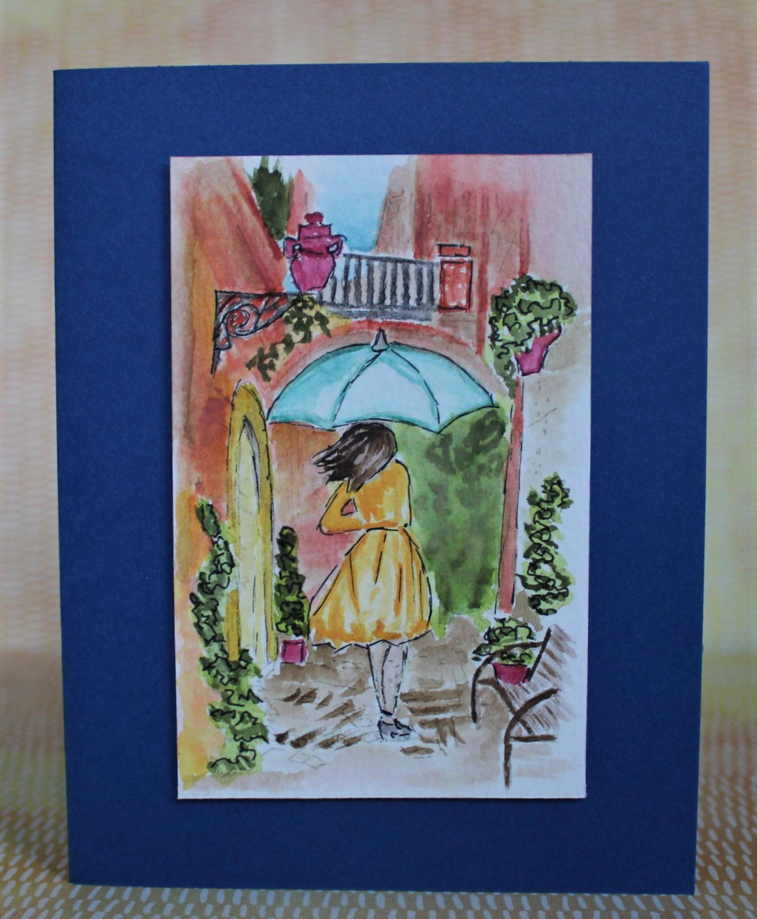 I used watercolour paper and first stamped the umbrella lady from Beautiful You with Sahara Sand, then masked her off and stamped the scene from Meditrannean Moments, again using Sahara Sand.