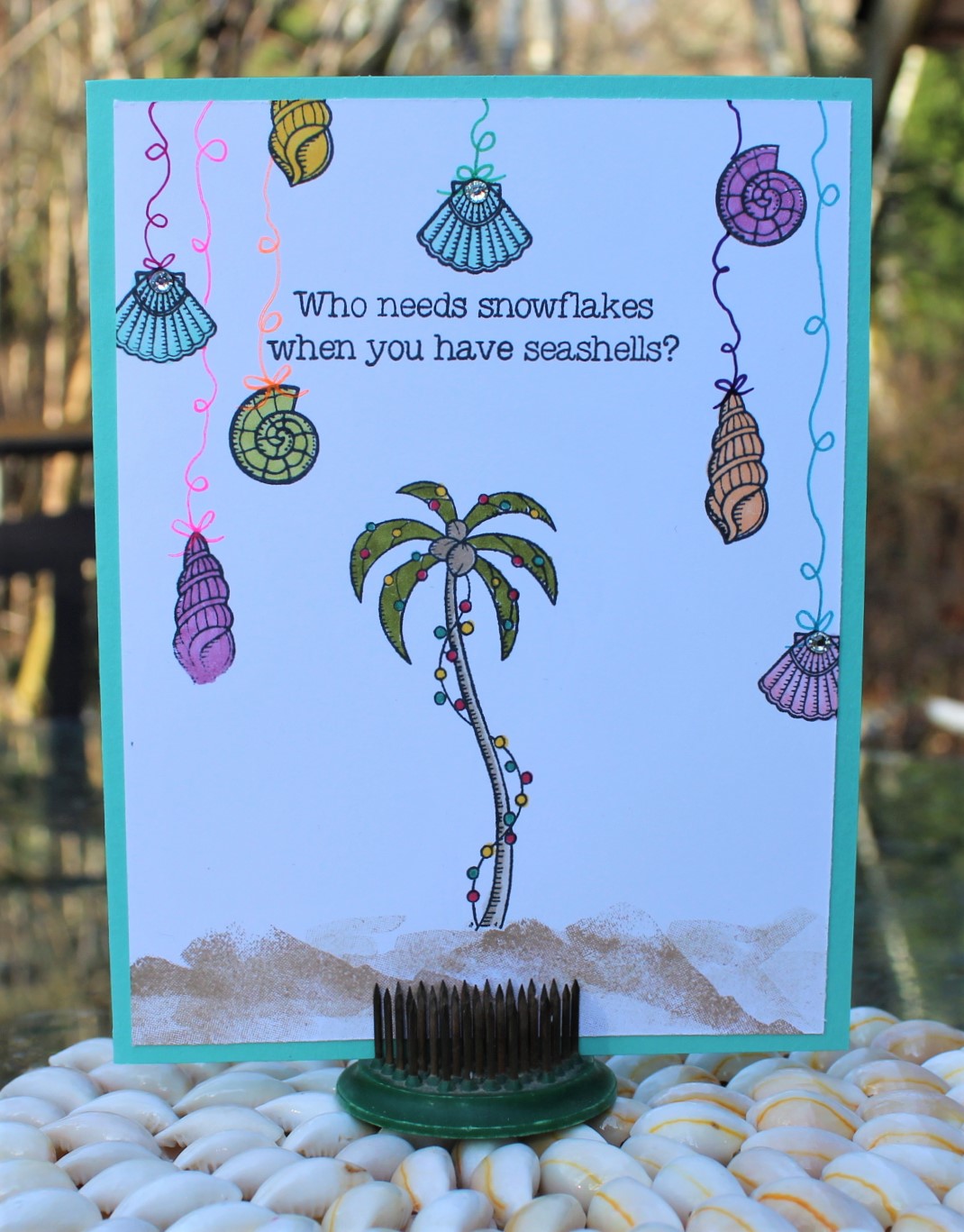 For the strings on the shells, I used some Sharpie ultra-fine tip markers. Some of the shells got a Basic Rhinestone for some sparkle. And to continue with the tropical theme, I used Coastal Cabana cardstock for the card base.